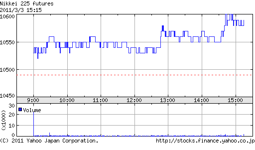 そんな地合いもあり、大引け前にカダフィ大佐がリビア和平案を受諾したと一部報道で伝えられると、先物主導で強引に上抜け10,600円を回復。結局その流れのままほぼ高値引けで終えている。