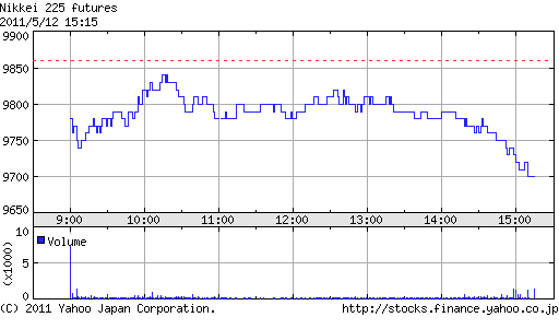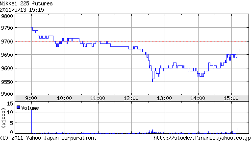 大引けにかけて断続的に大口買いが入り一時9,700円に到達。