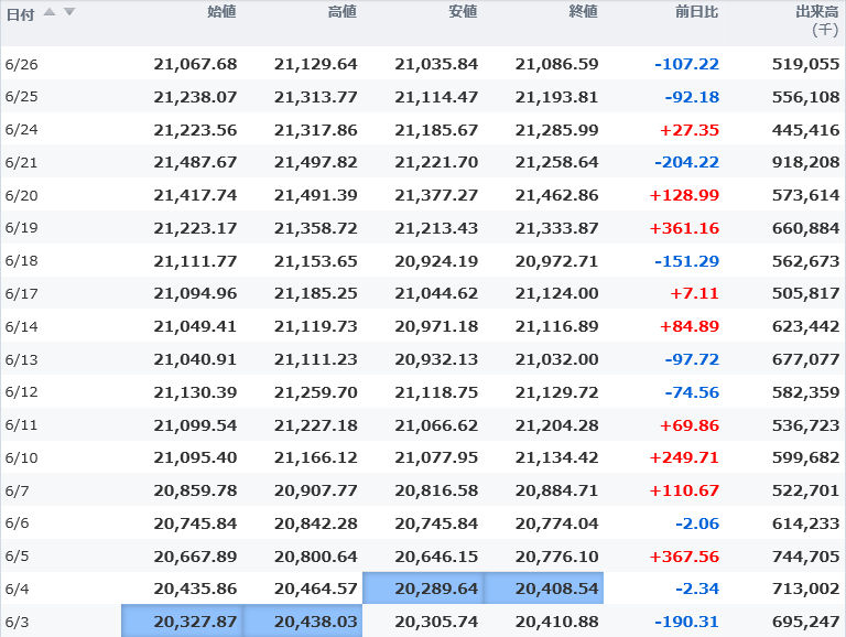 安値 21,199.85