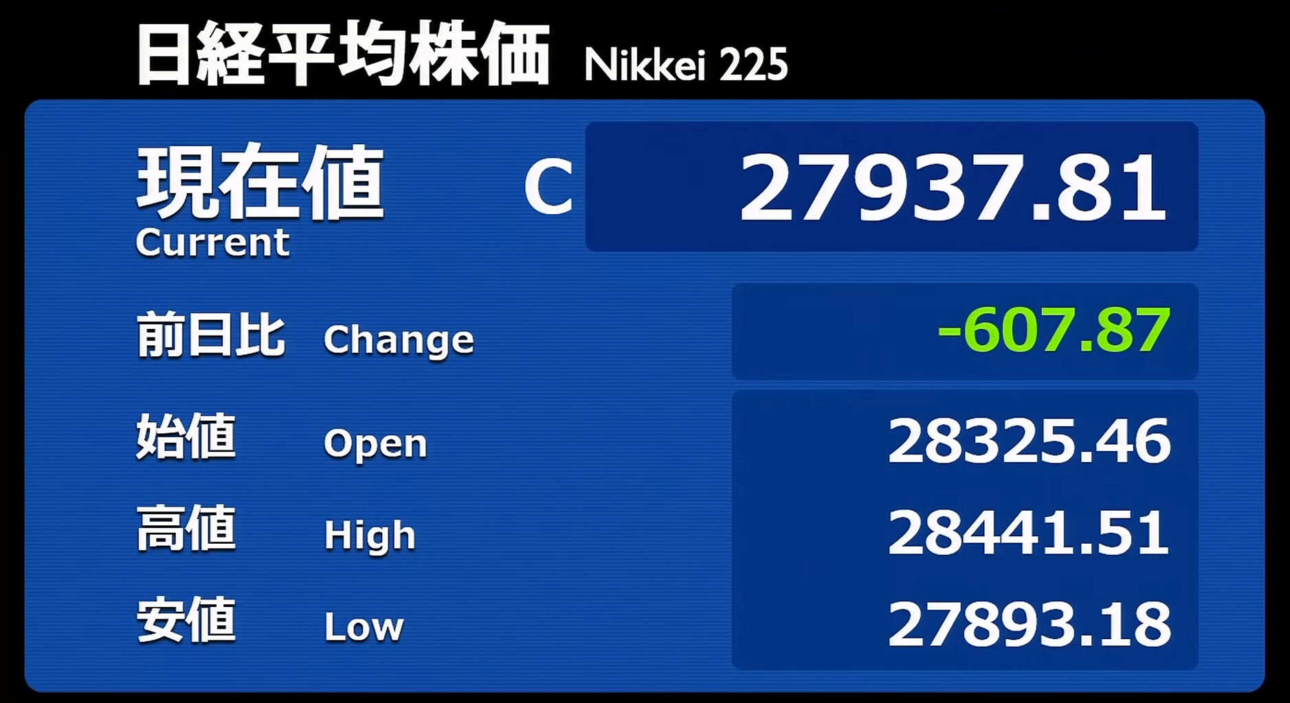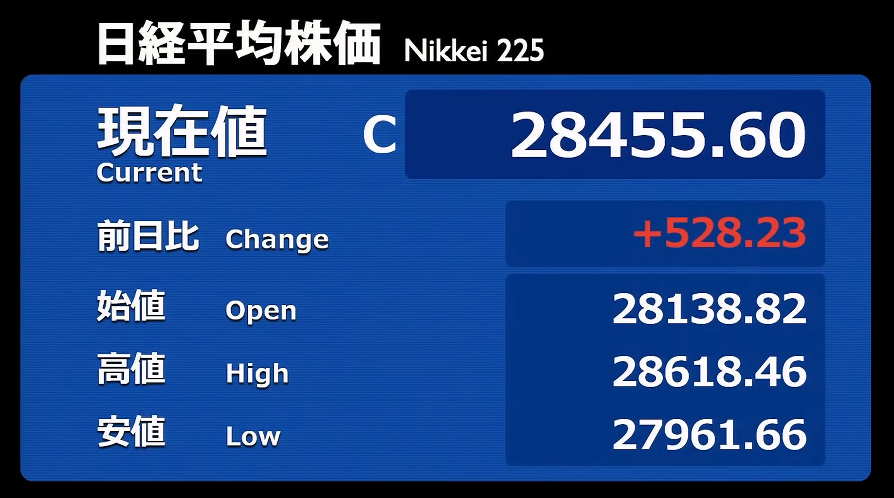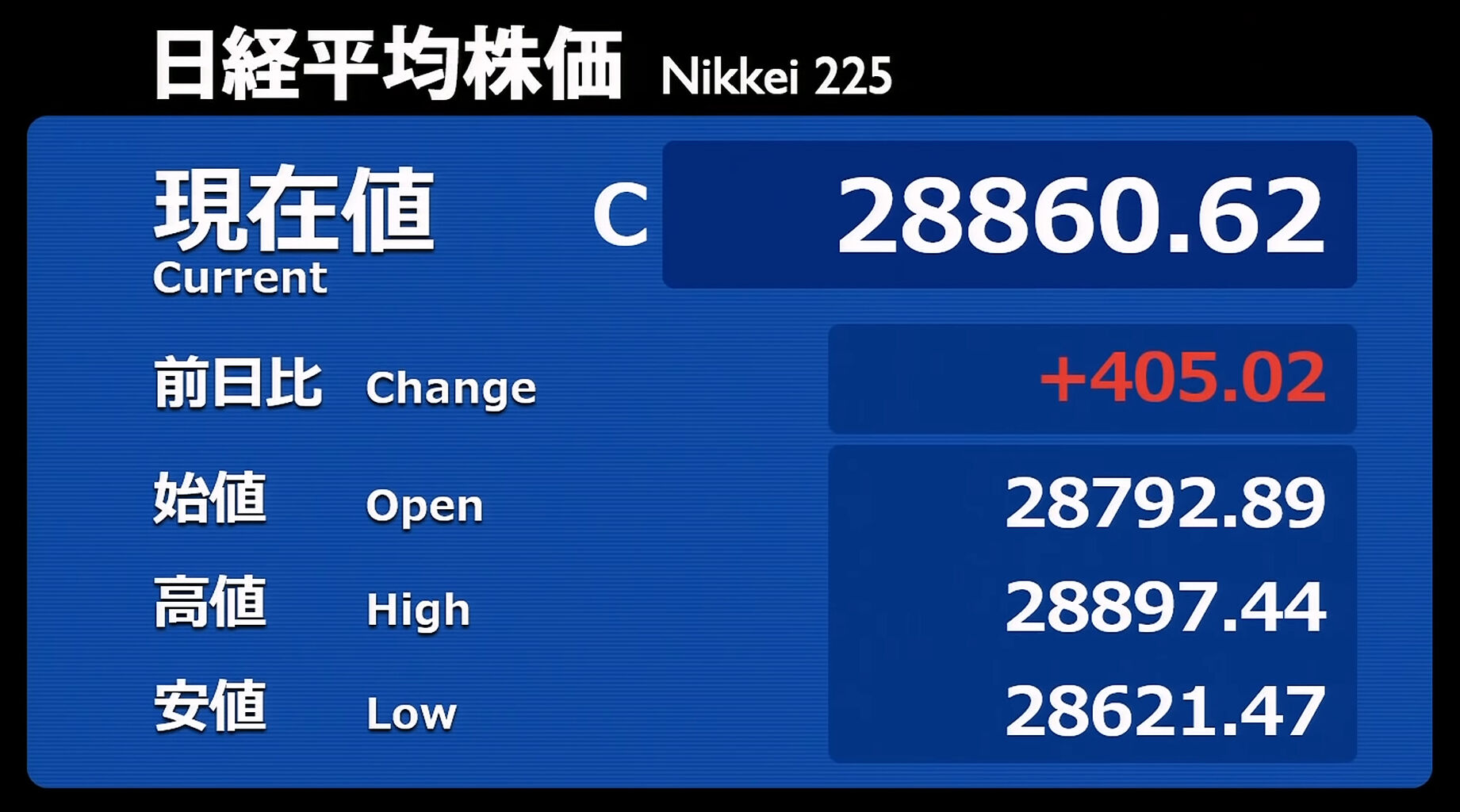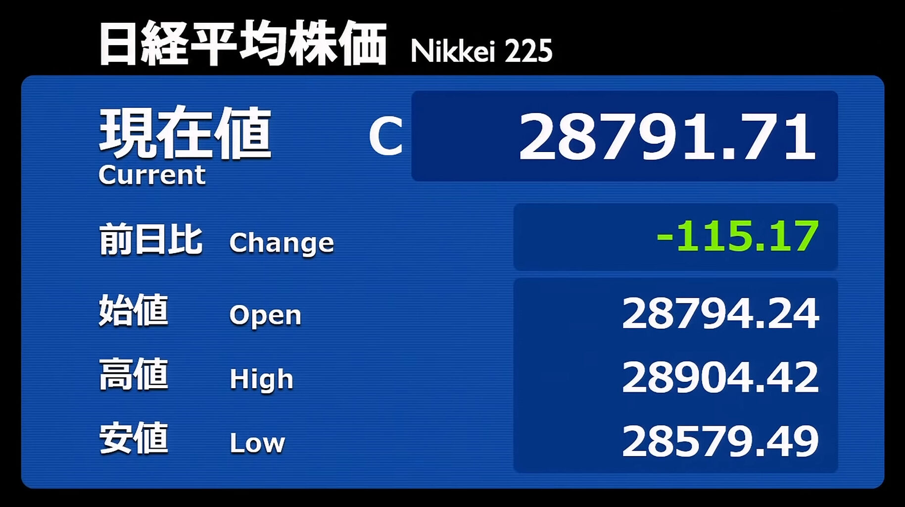 日経平均は続落。先物は110円GUで始まり、序盤は戻り売りが先行し、一時安値28,550円まで突っ込む場面もあったが、間もなく切り返し、上海開場とともに一段高。