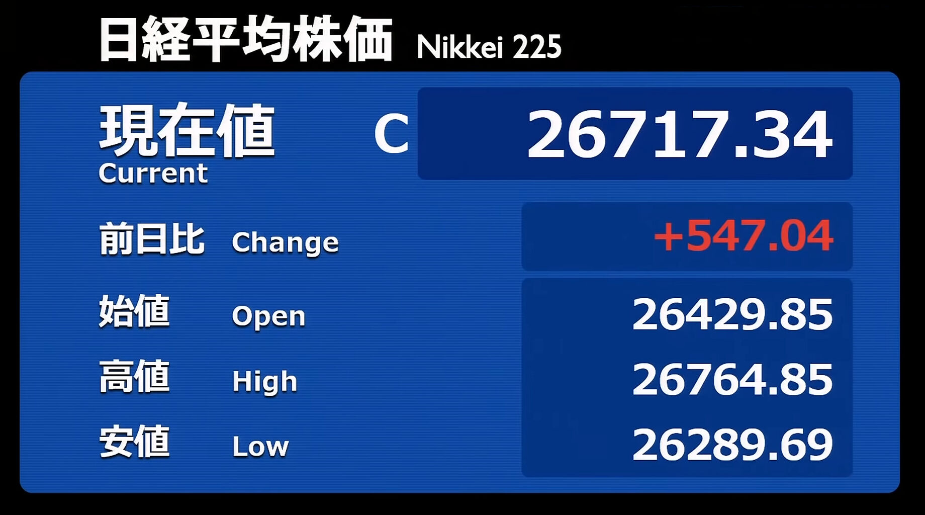 朝方は断続的に買われて大台2万7千円台を難なく回復。一時高値27,120円まで上値を追う場面も。