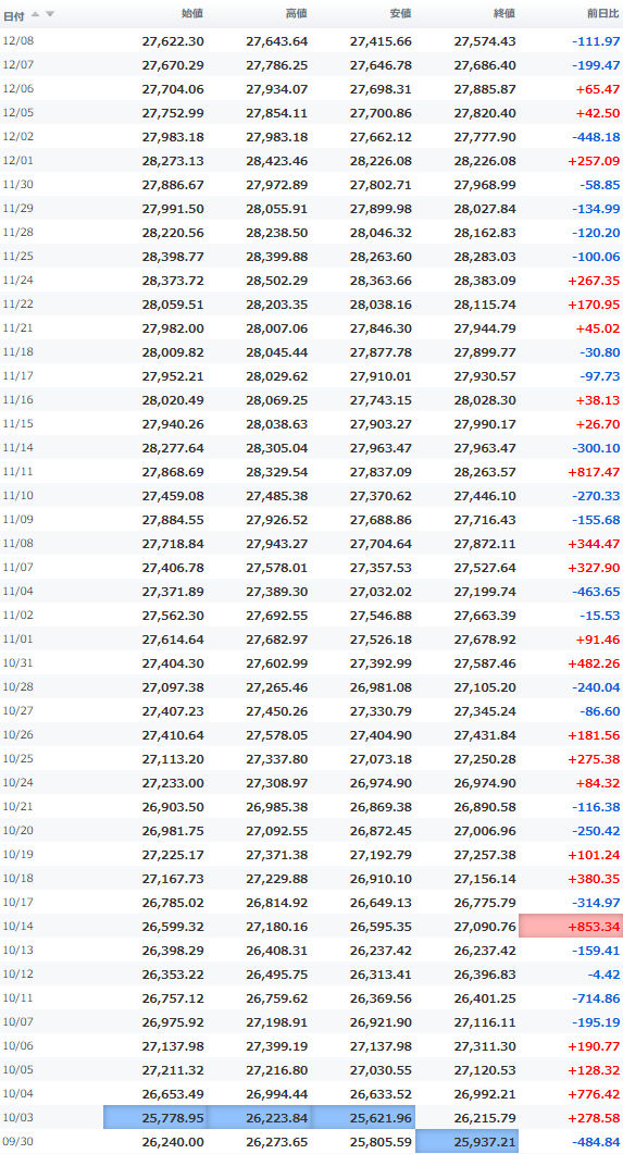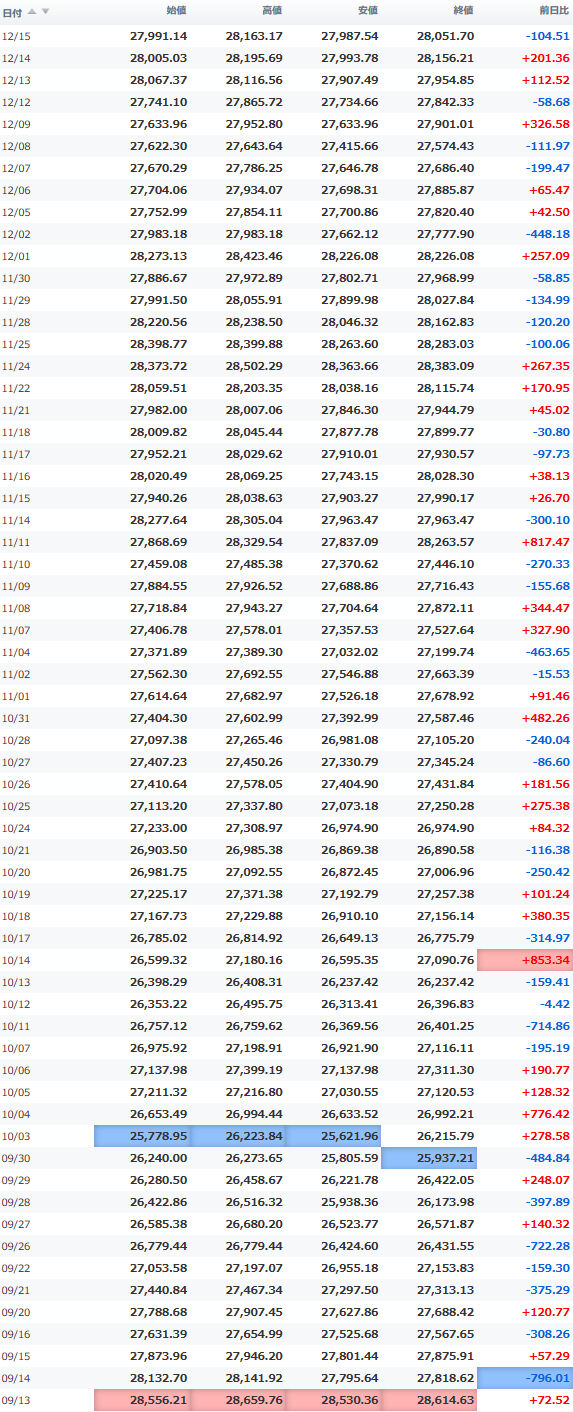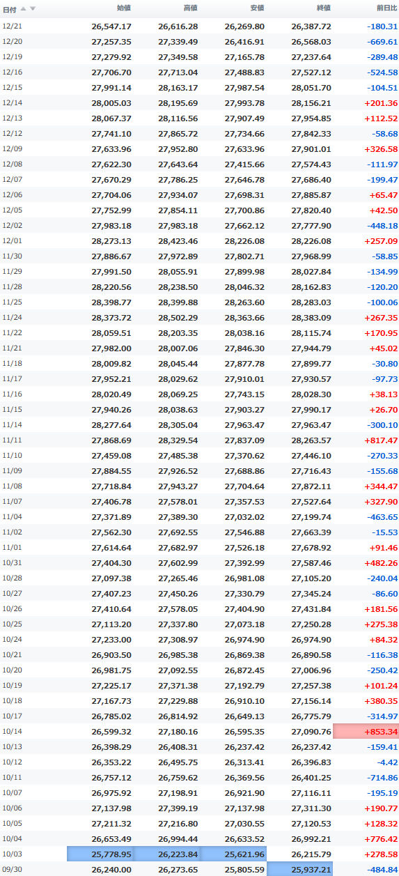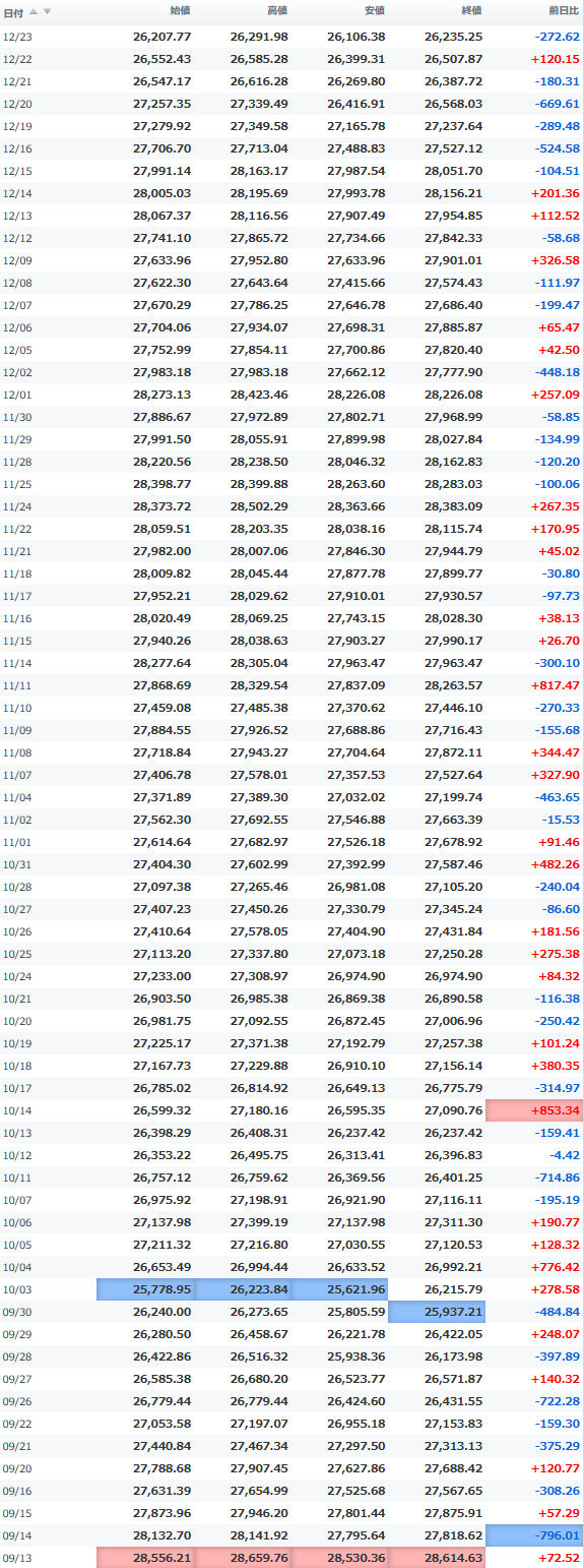 一時安値25,980円をつけながらほぼ安値引けで終えている。