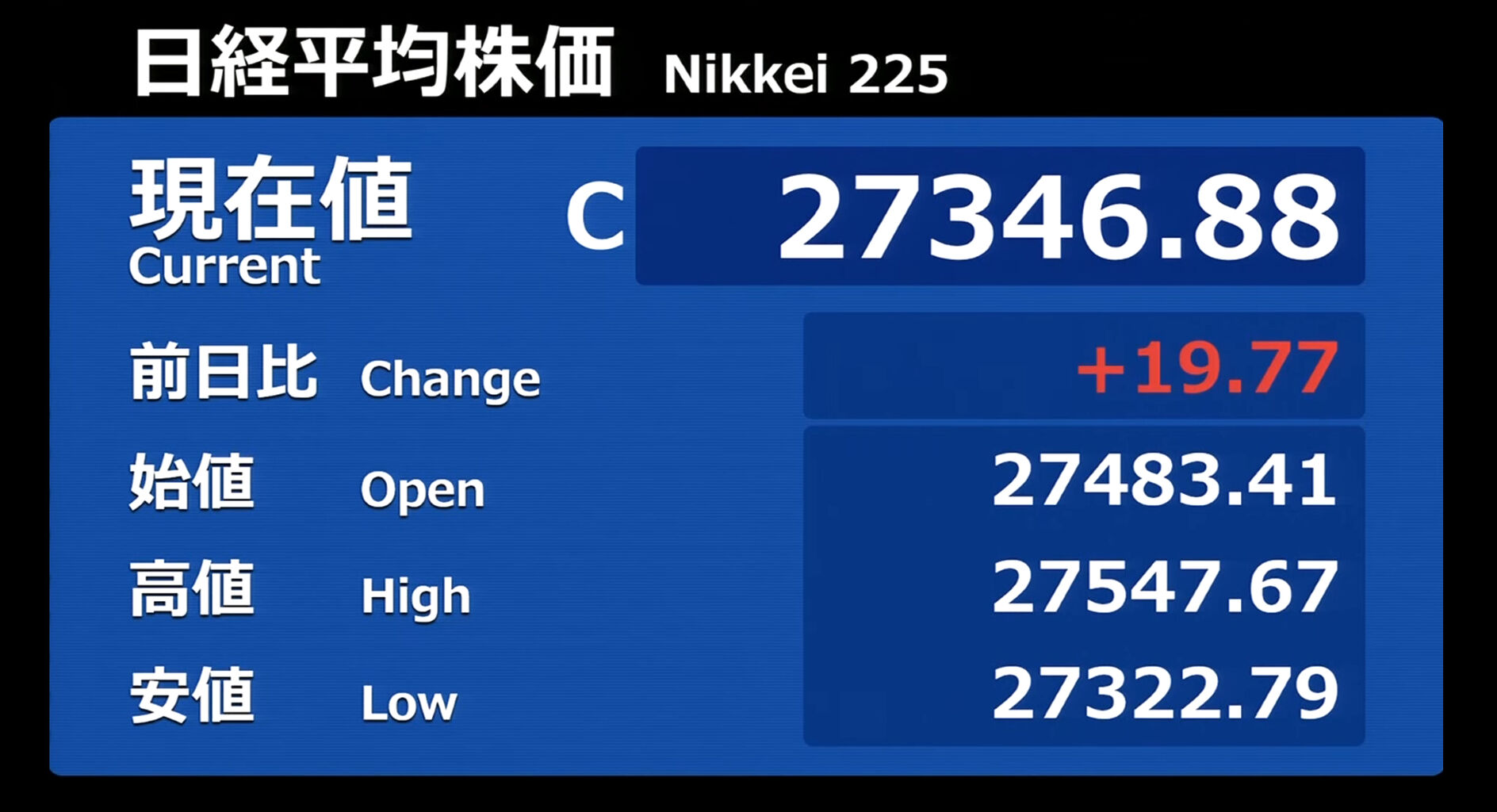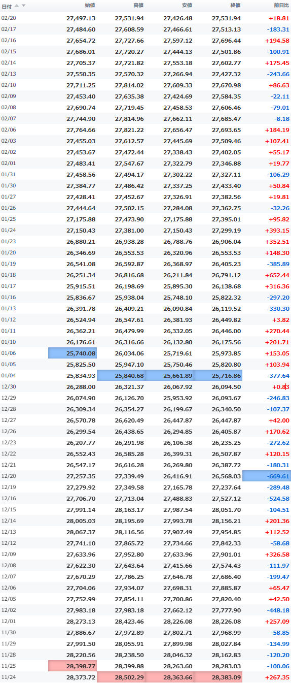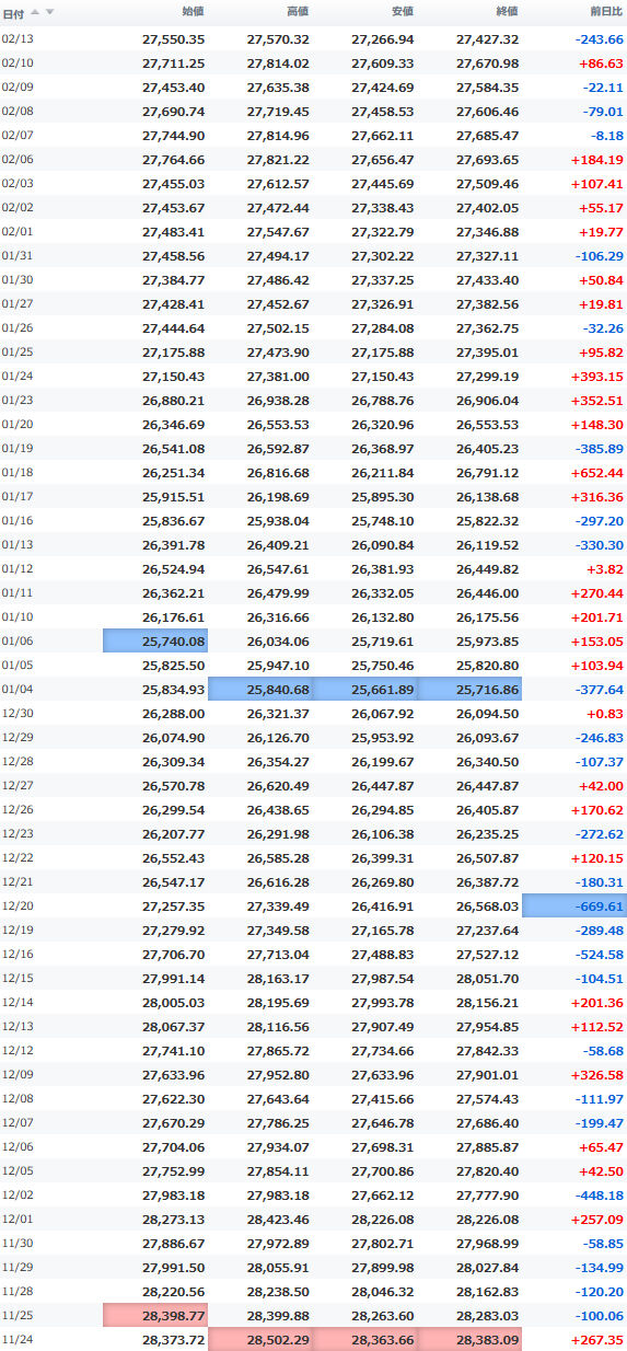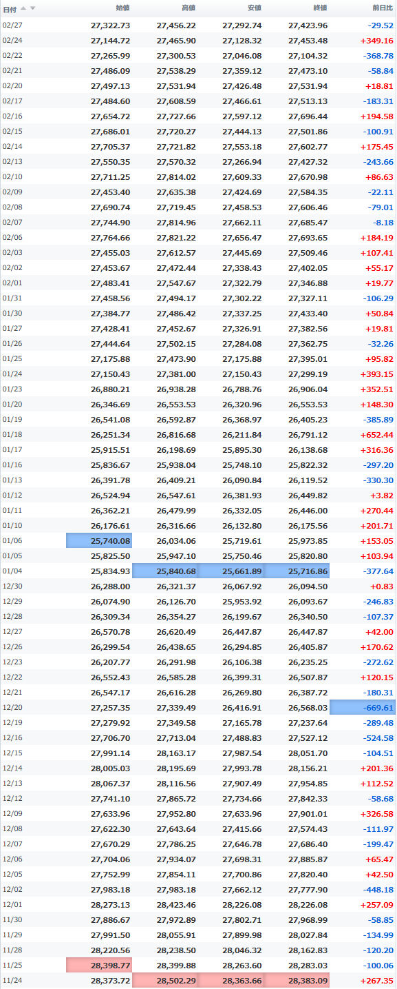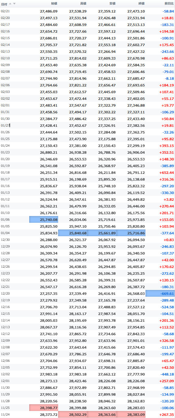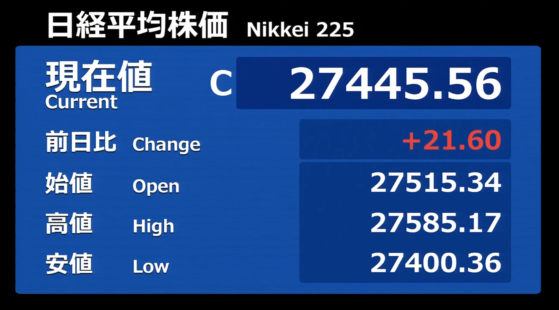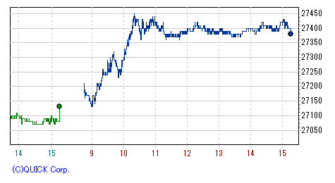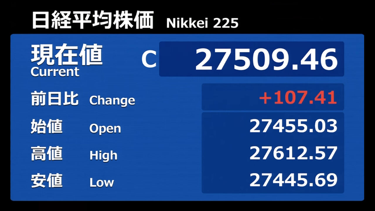日経平均株価 終値 27,445.56(+21.60)