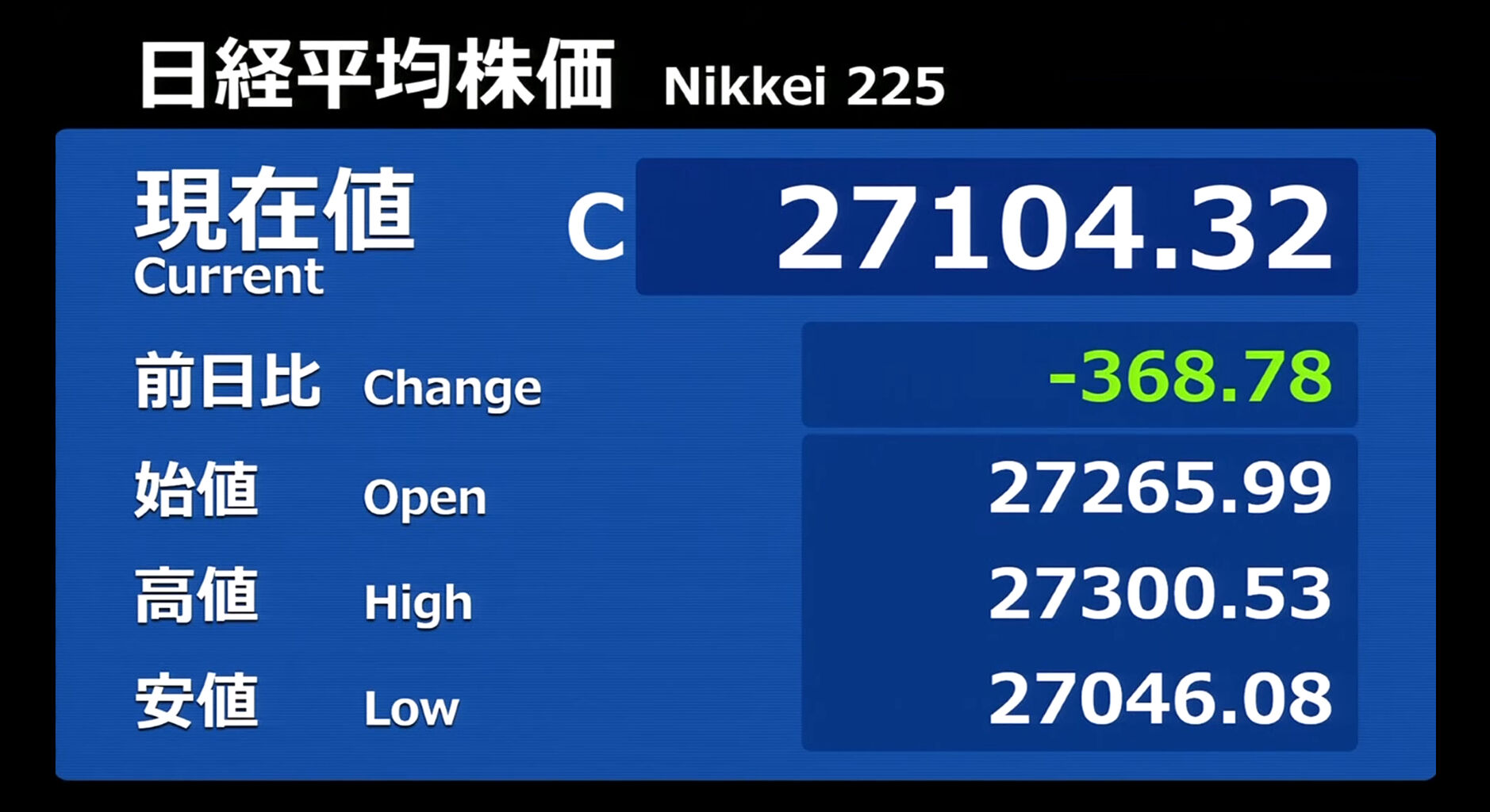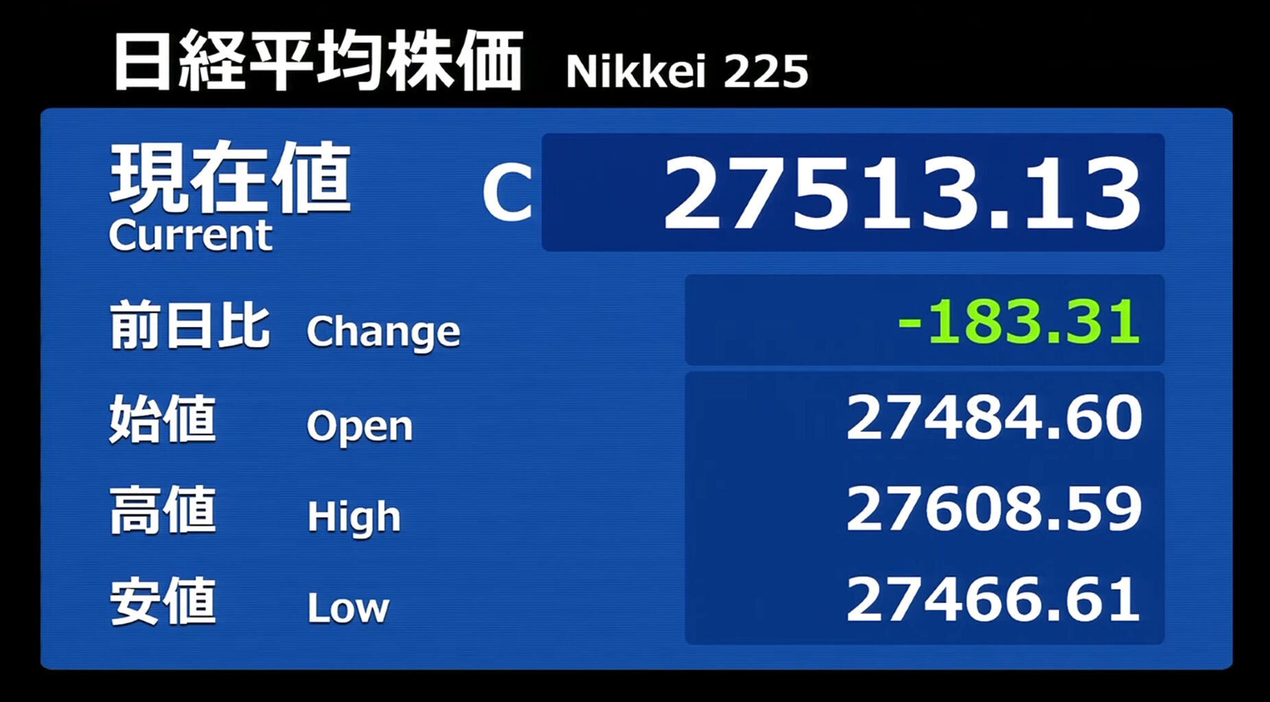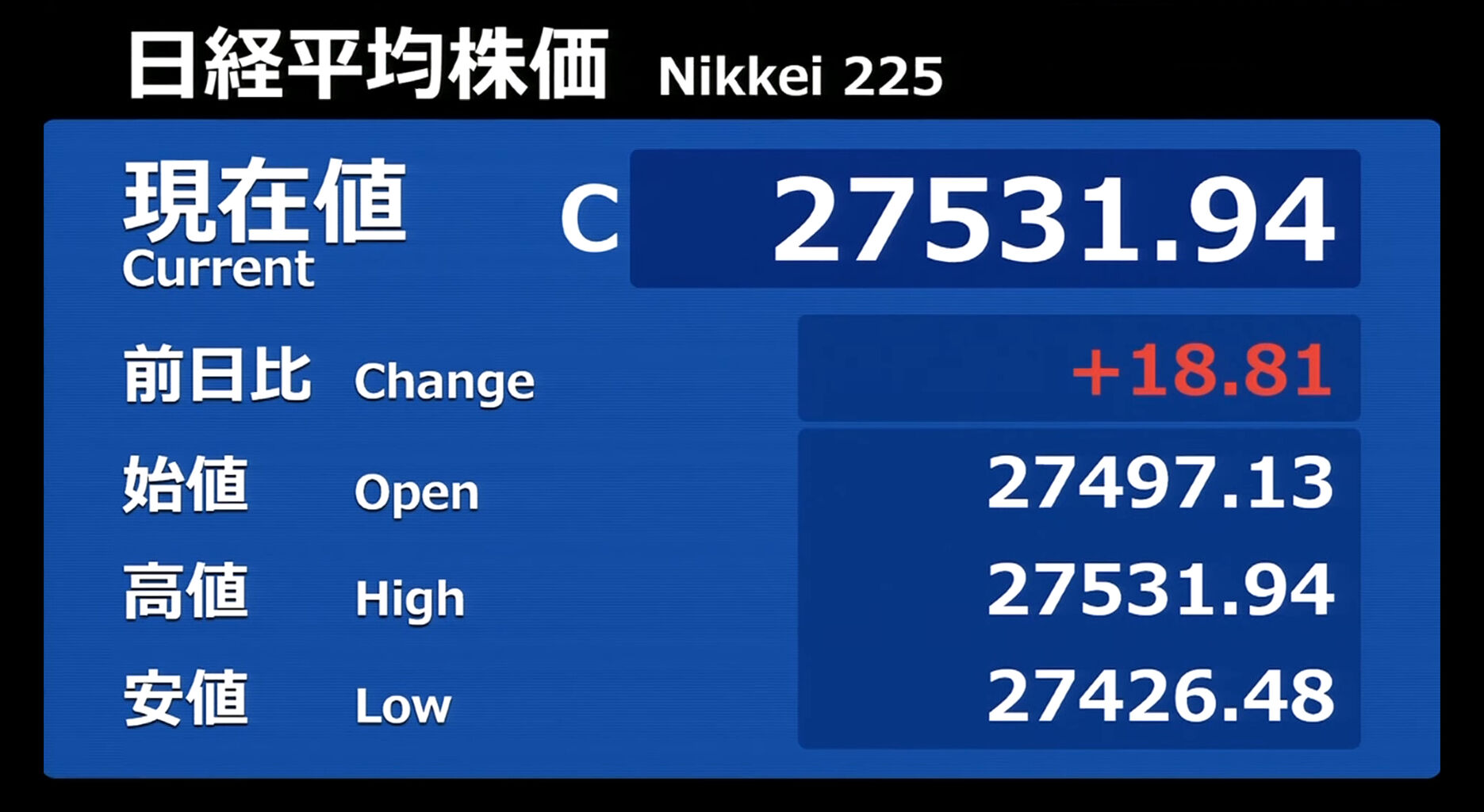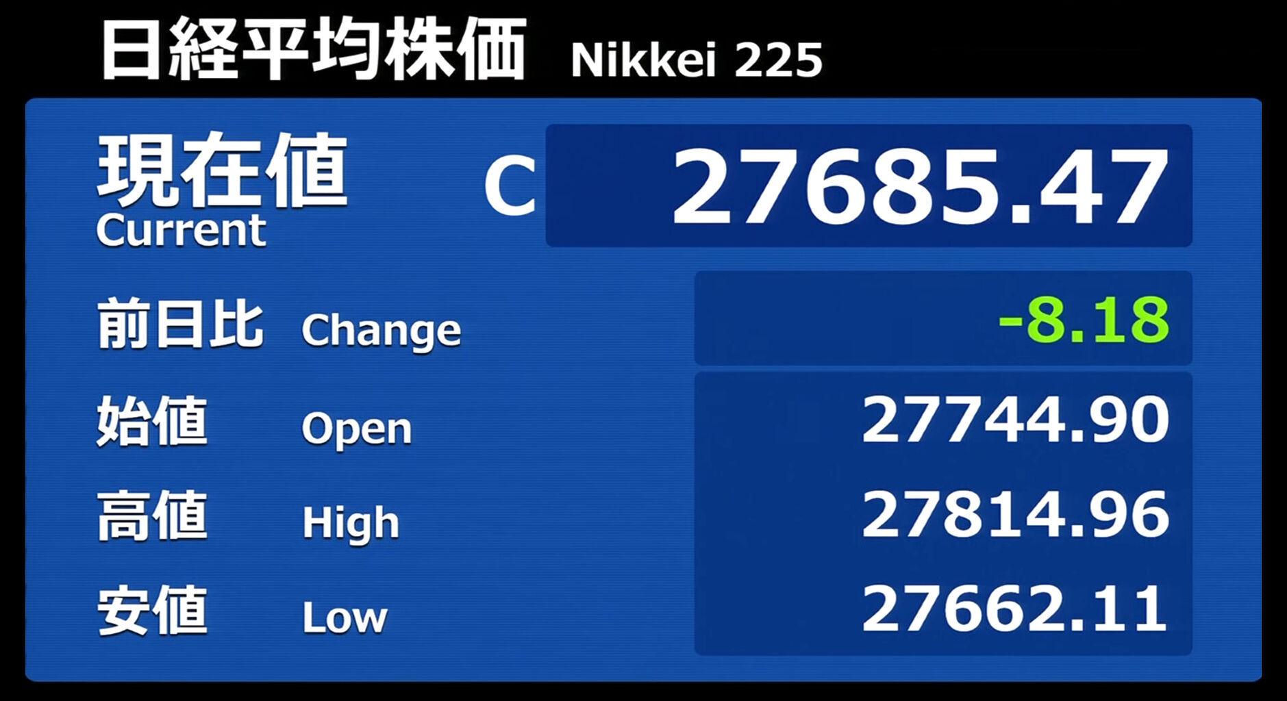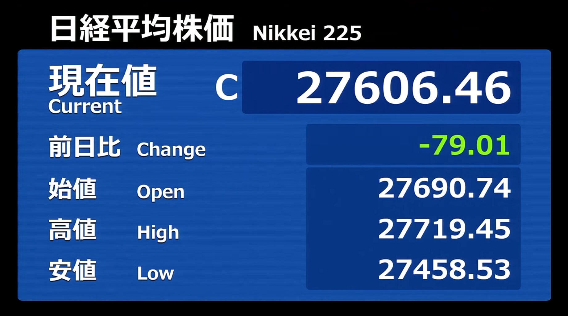 日経平均株価 終値 27,445.56(+21.60)