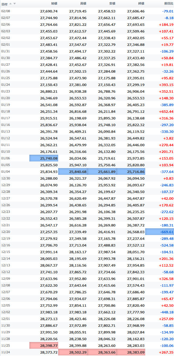 しかし、上値も限定的で、何度か上値を試す場面も見られたが、一時高値27,580円を天井に失速頭打ち。