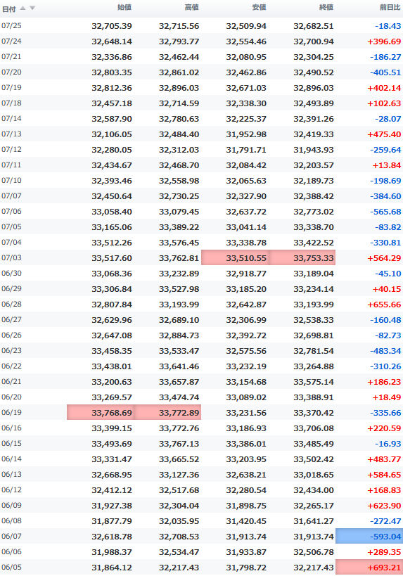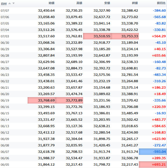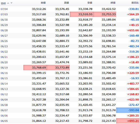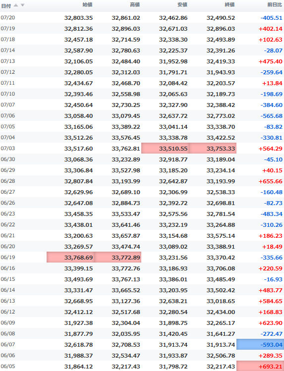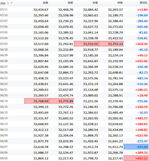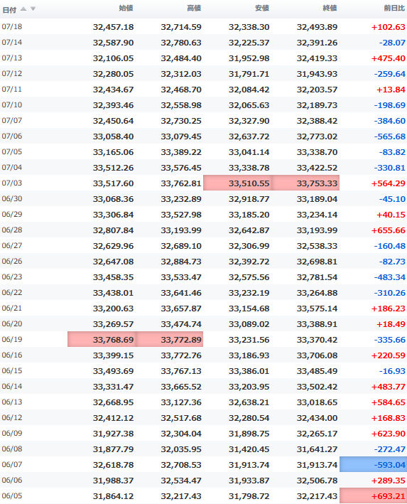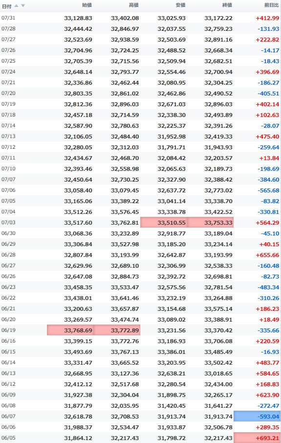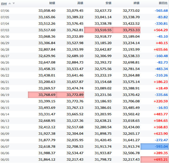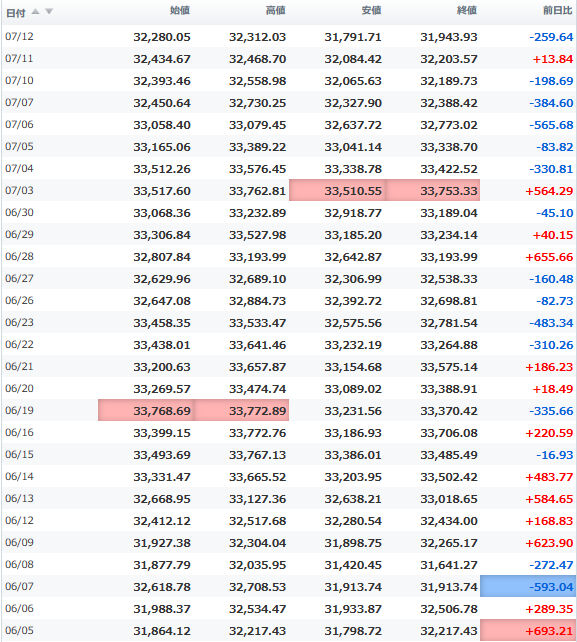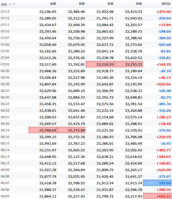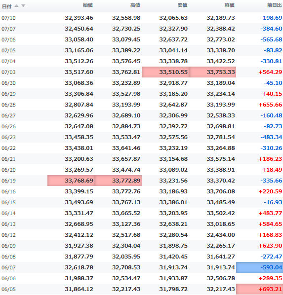 一時安値32,990円に突っ込む場面もあったが、間もなく切り返し、3万3千円の大台を堅持。