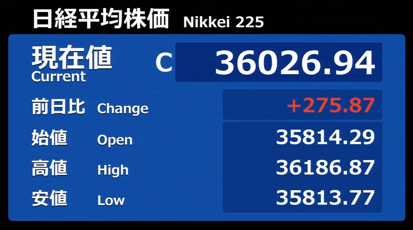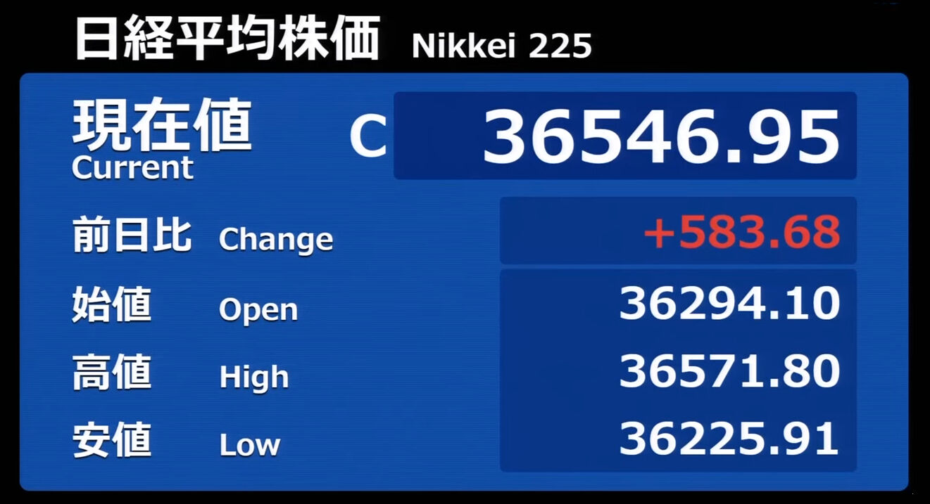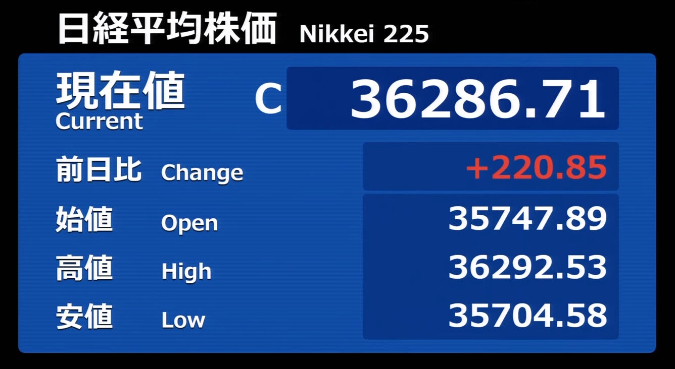 日経平均は3日続急伸。先物は300円GDで始まり、朝方こそ3万6千円を割り込んで売り買いが交錯する展開が続いていたが、間もなく一巡し三角保ち合いを上放れ。