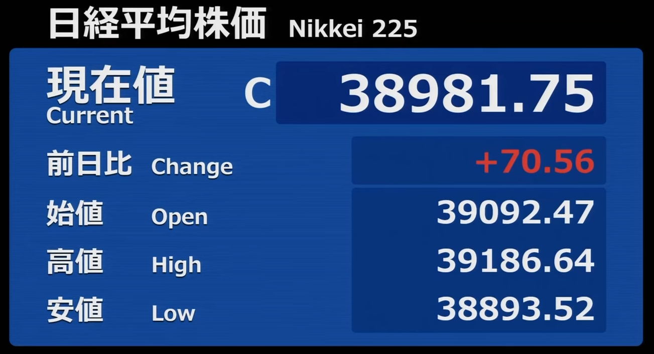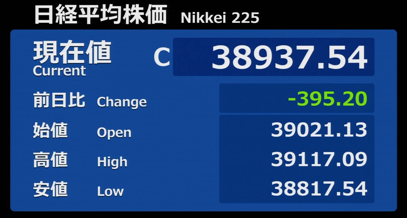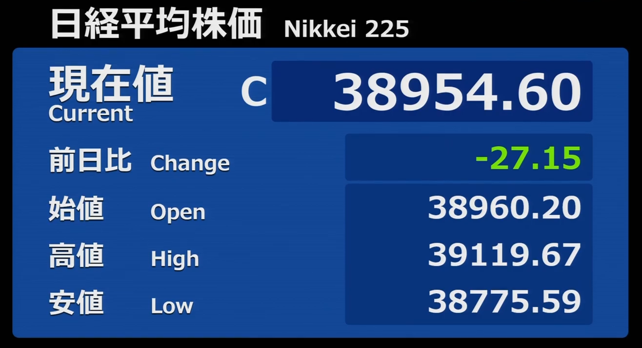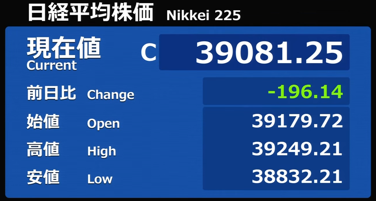 日経平均株価 終値 39,081.25(-196.14)