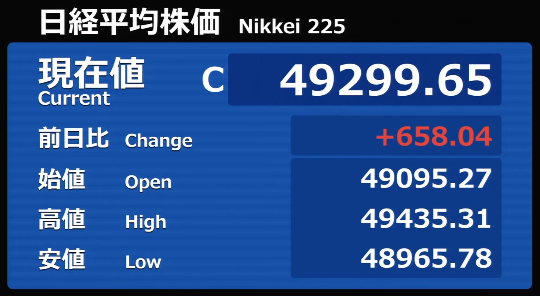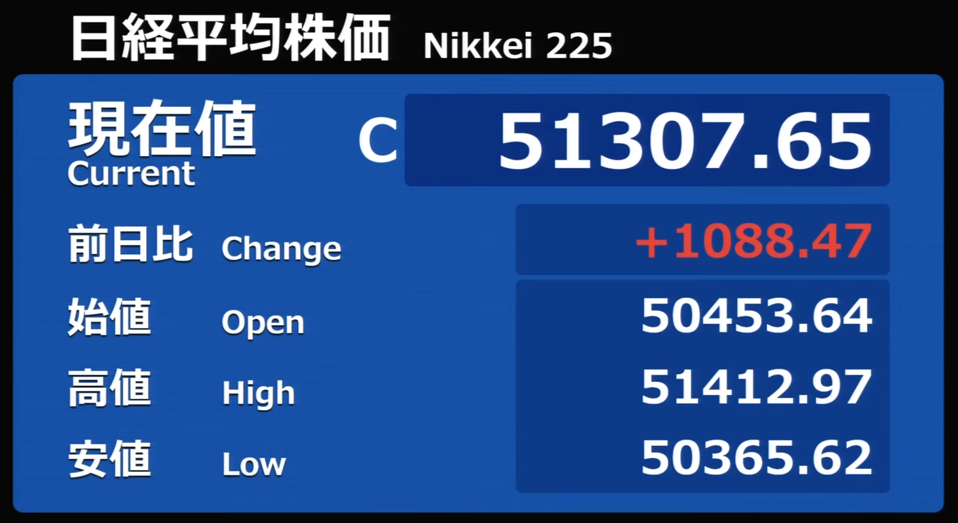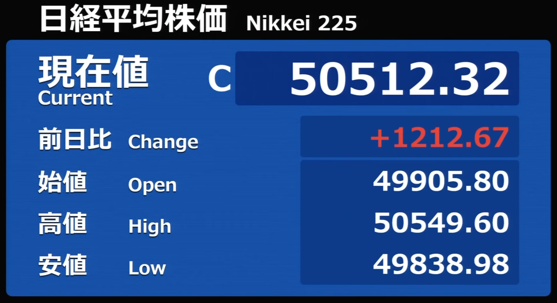 日経平均は1千円超高の3日続伸。史上初の5万2千円台乗せ。