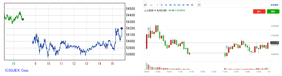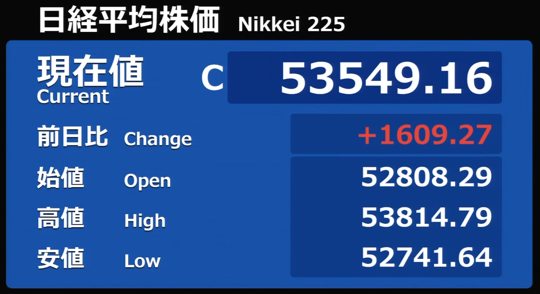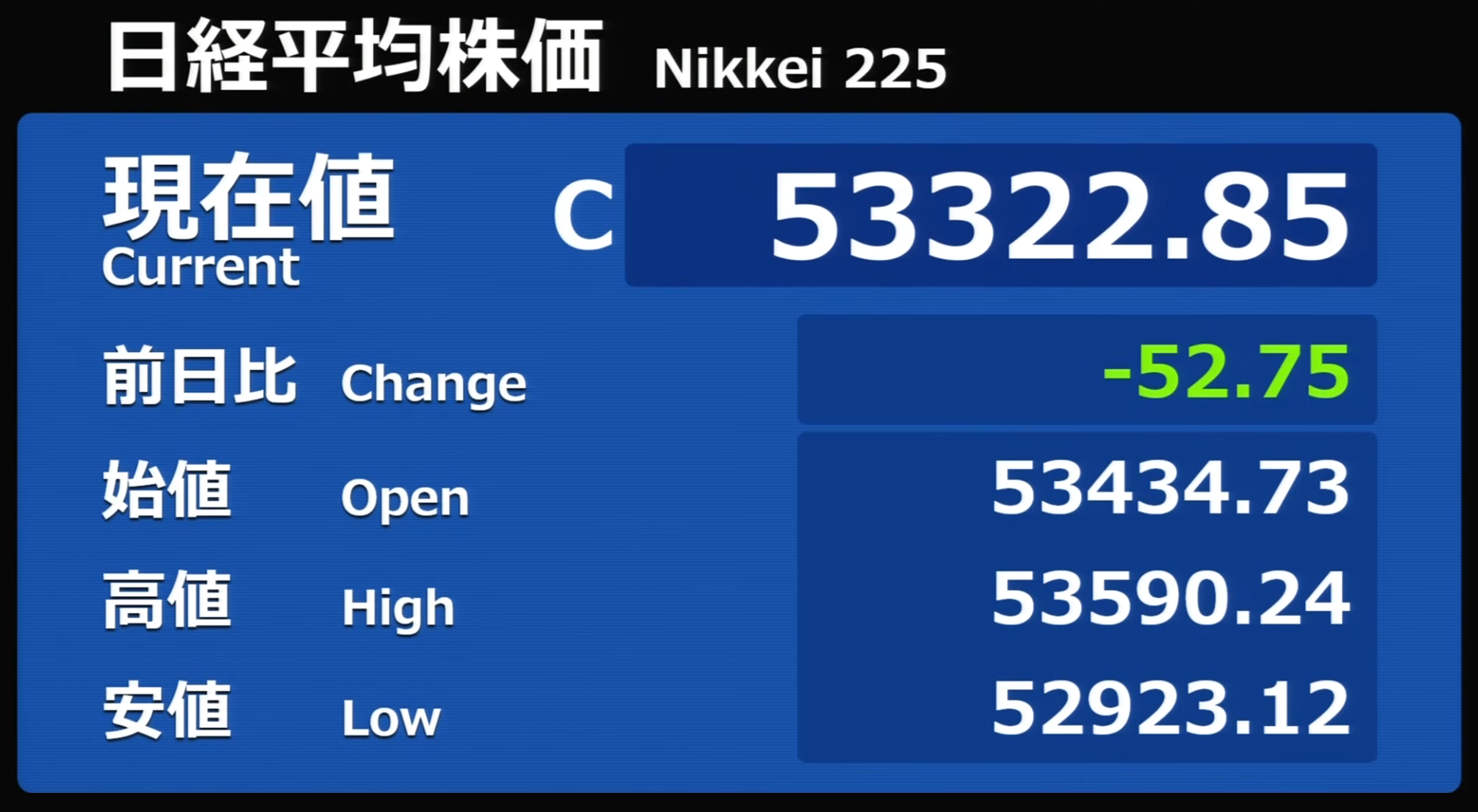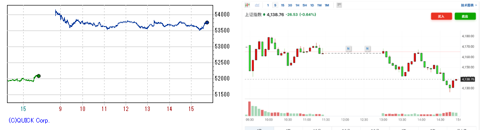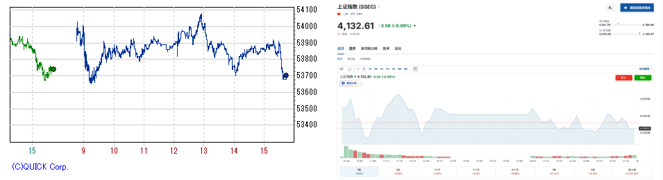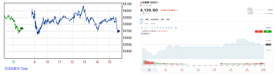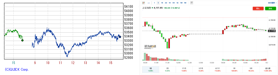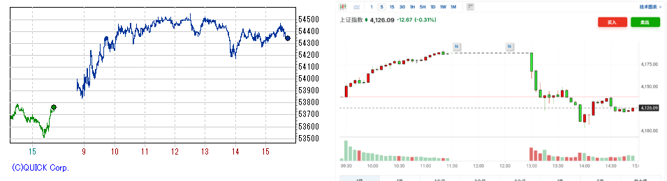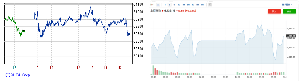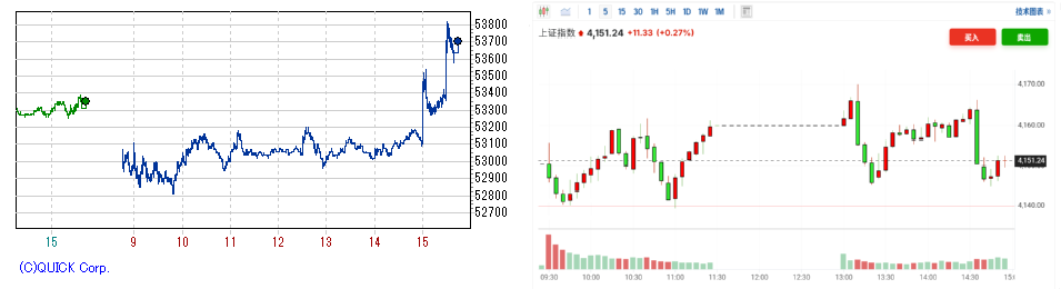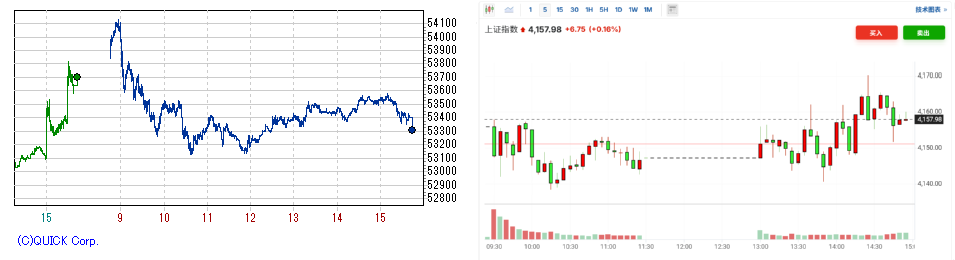 それでも朝方は5万3千円台を堅持し、上海開場を前後に再騰勢から一時高値53,610円をつける場面も。