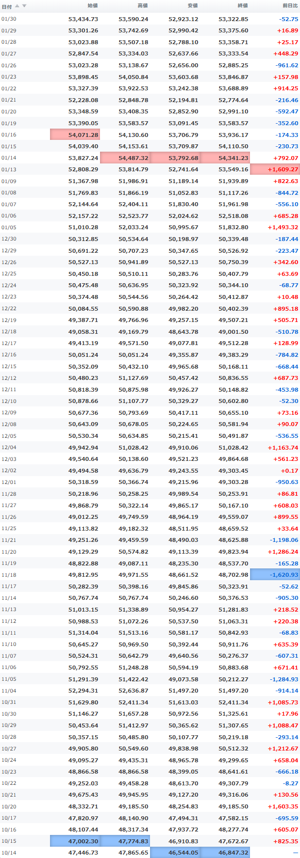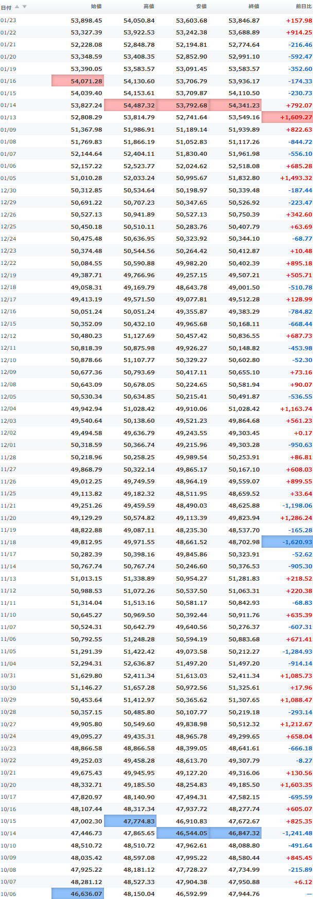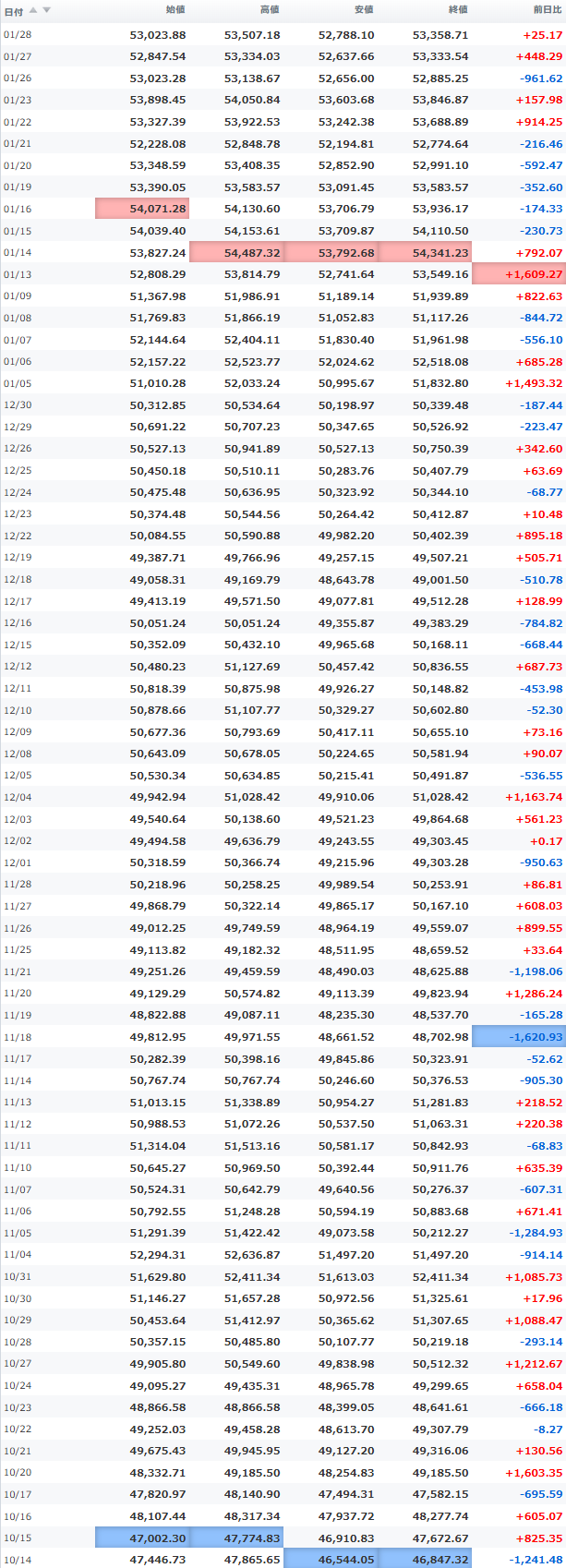一時安値52,920円、前日比で860円安にまで突っ込む場面もあったが、結局こちらも元鞘に。