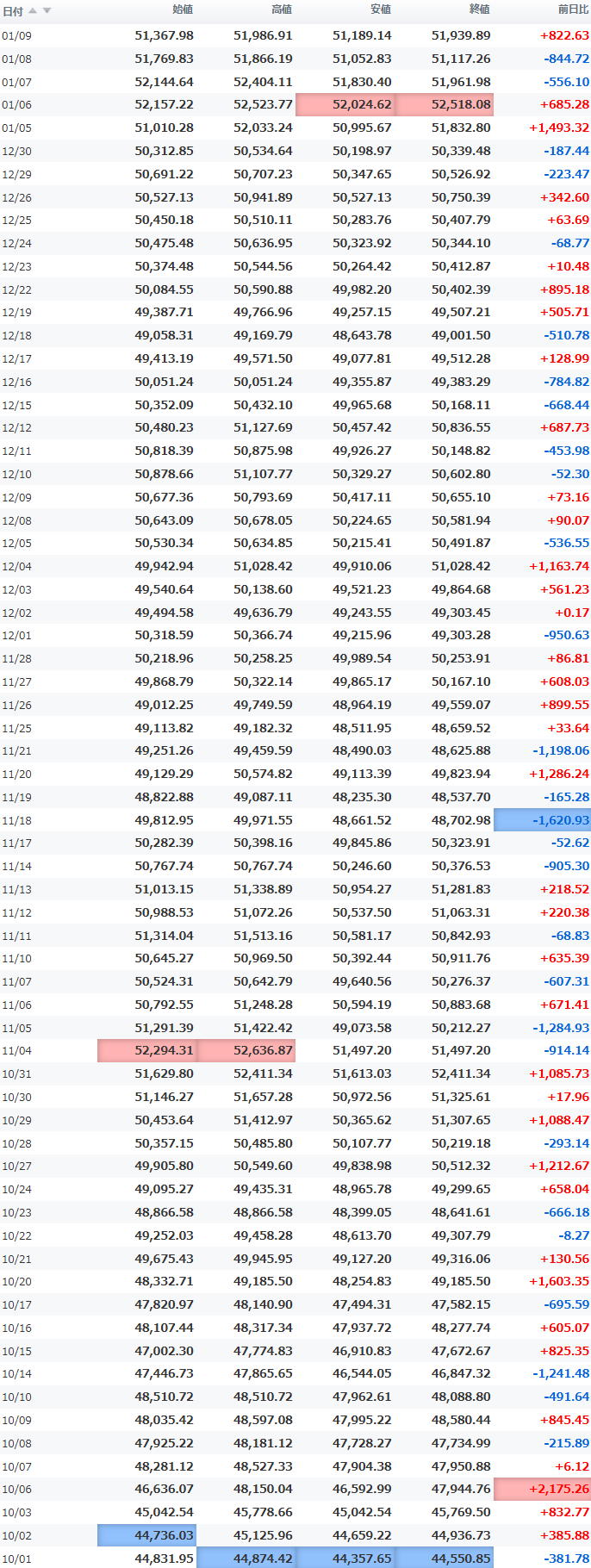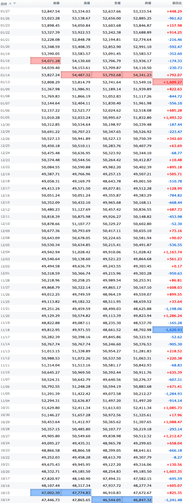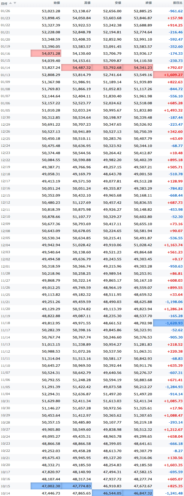 一時安値52,920円、前日比で860円安にまで突っ込む場面もあったが、結局こちらも元鞘に。