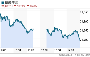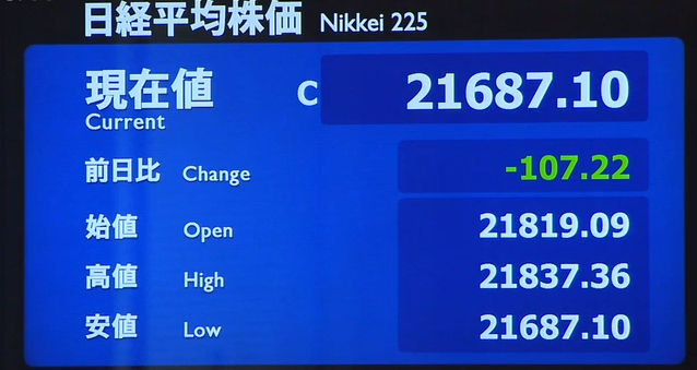 日経平均株価 終値 21,687.10(-107.22)