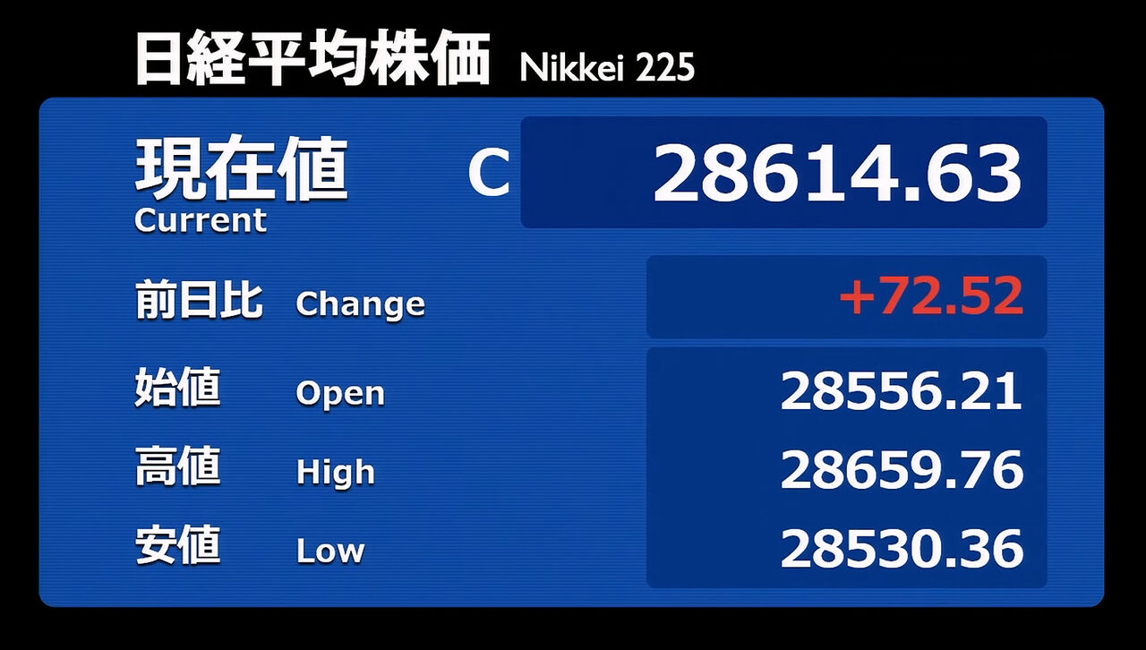 日経平均株価 終値 28,614.63(+72.52)