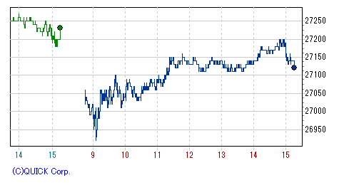 大台の2万7千円をあっさり割り込み、一時安値26,920円まで突っ込む場面もあったが、間もなく切り返し、じりじりと下げ幅を縮小。
