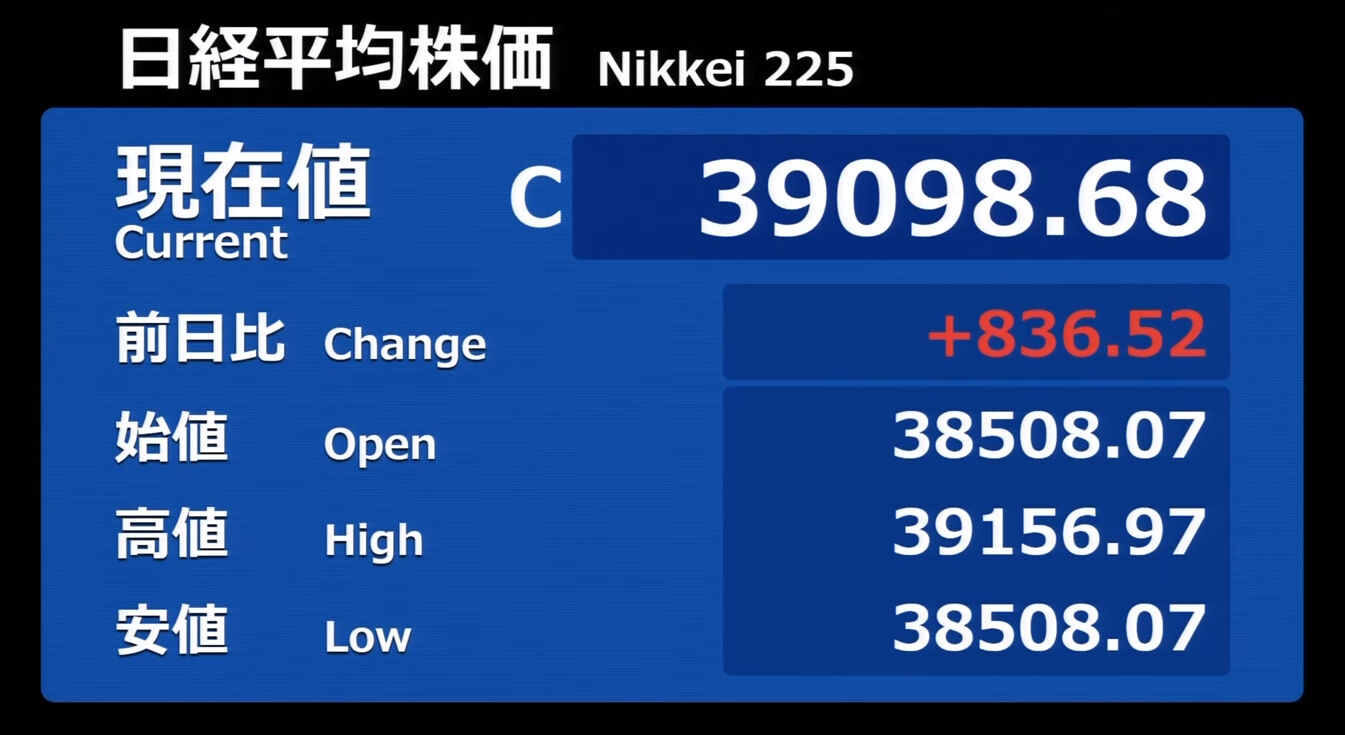 日経平均株価 終値 39,098.68(+836.52)