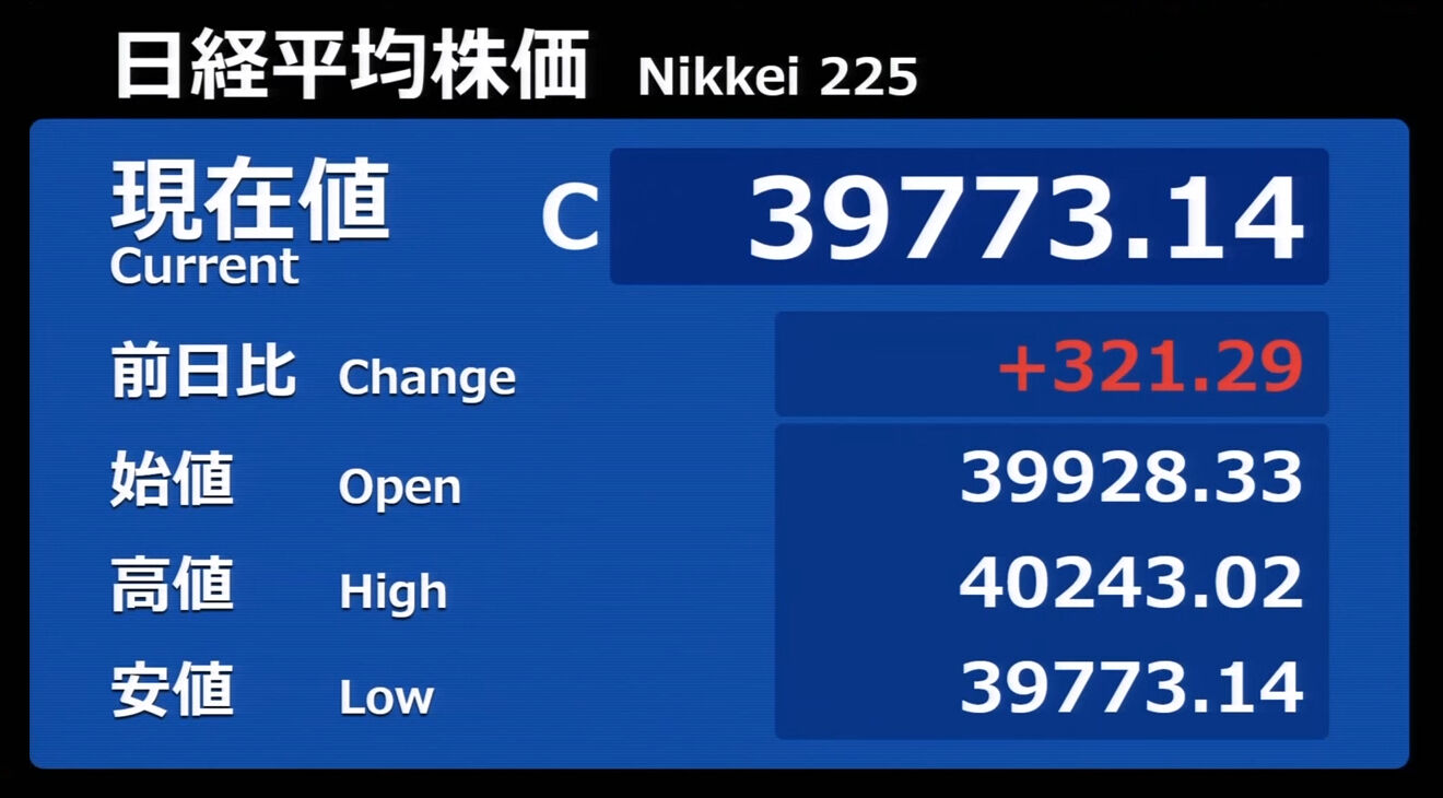 日経平均株価 終値 39,773.14(+321.29)