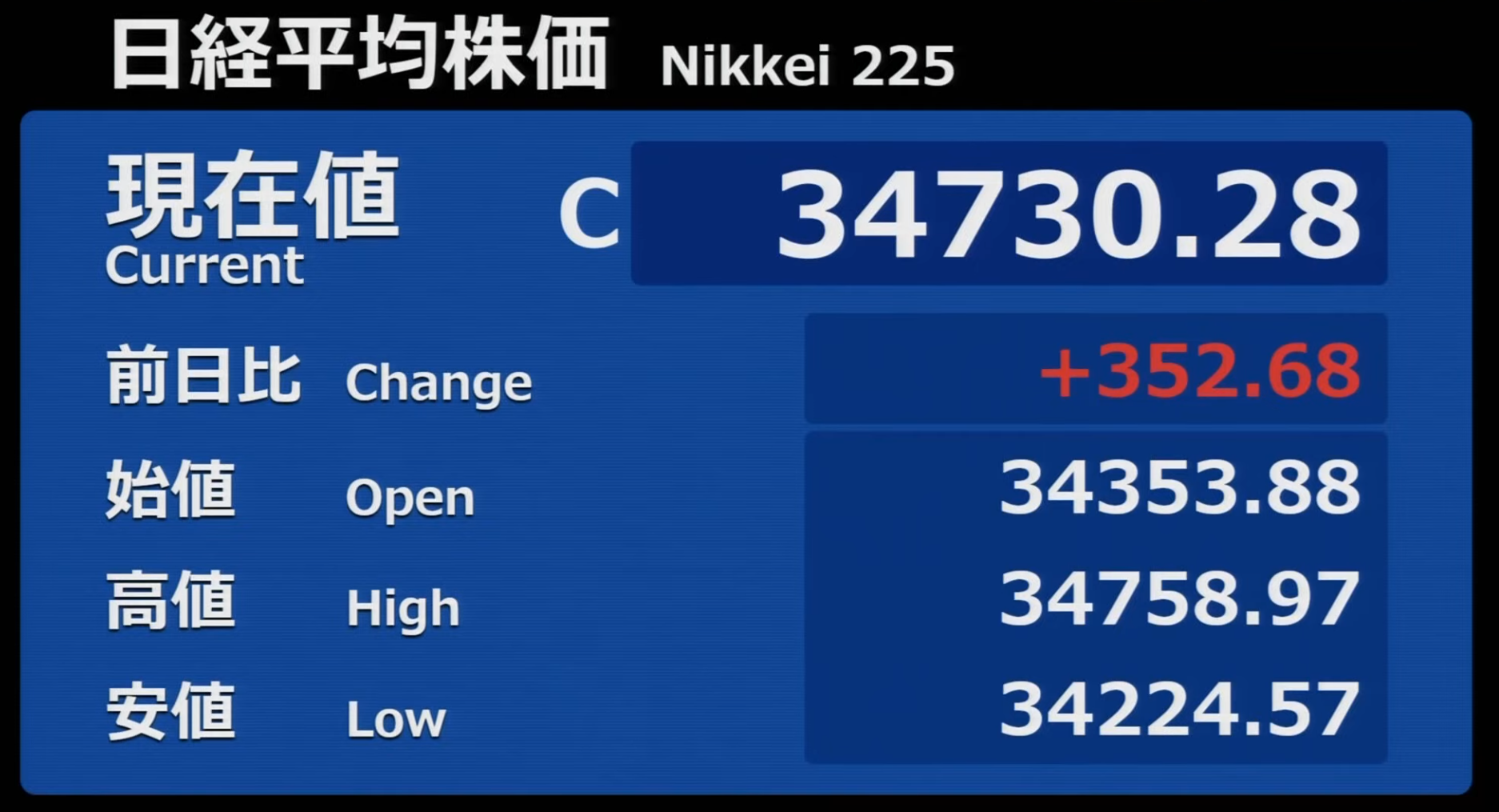 日経平均株価 終値 34,730.28(+352.68)