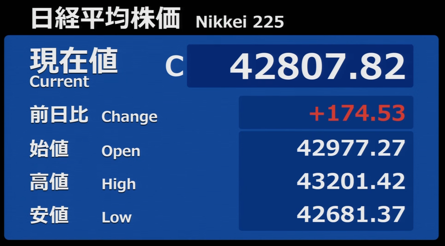 日経平均株価 終値 42,807.82(+174.53)