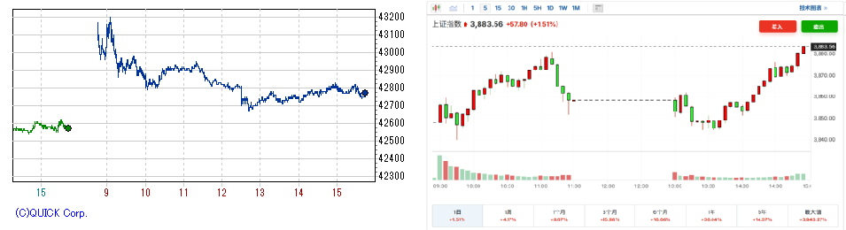 9時直後には再騰勢から一時高値43,000円をつけるなど、序盤は激しく売り買いが交錯した。