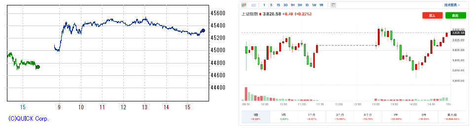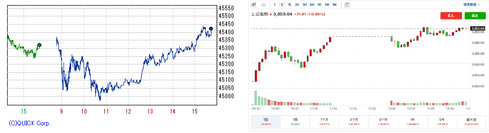 引けにかけて一段高し、一時高値45,440円をつけながら、結局本日の高値圏で取引を終了。