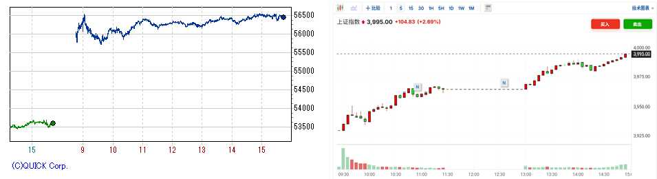日経平均は2千円超、実に2,800円超高の4日続急伸。