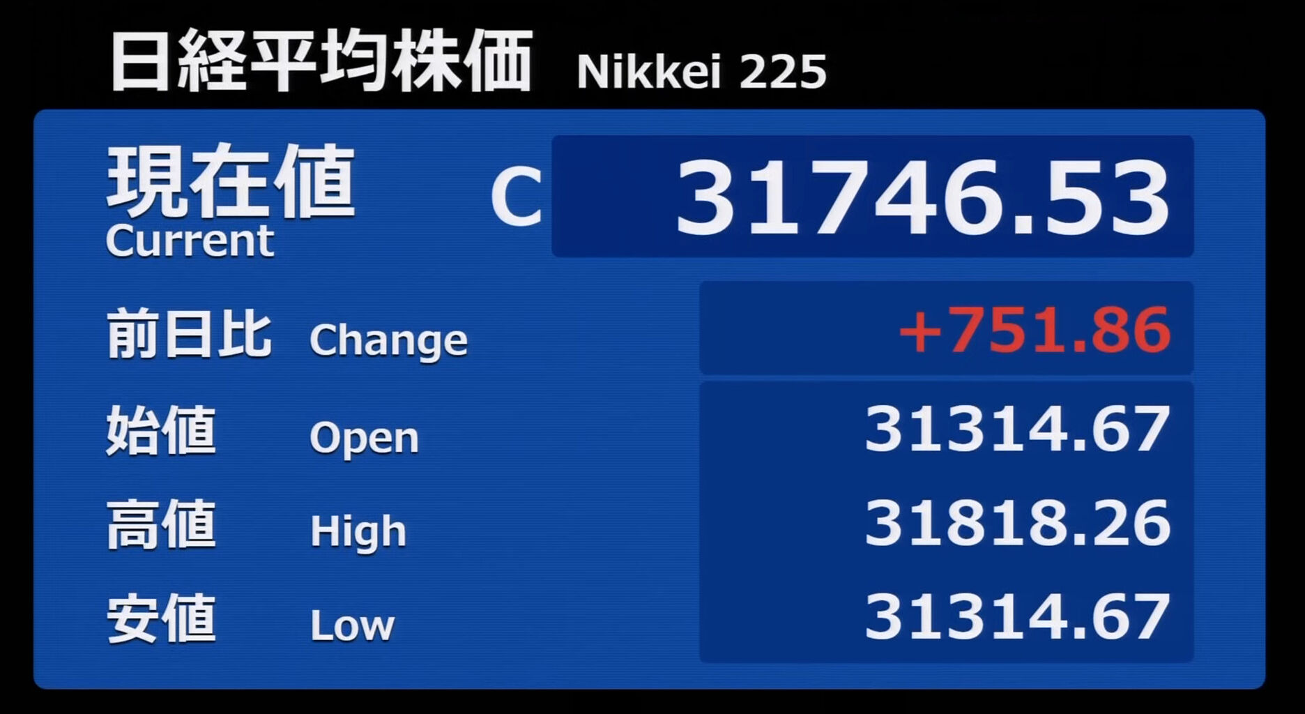 大台を挟んでの攻防も早々に決着し、午後には騰勢が増すと引けにかけて一段高。