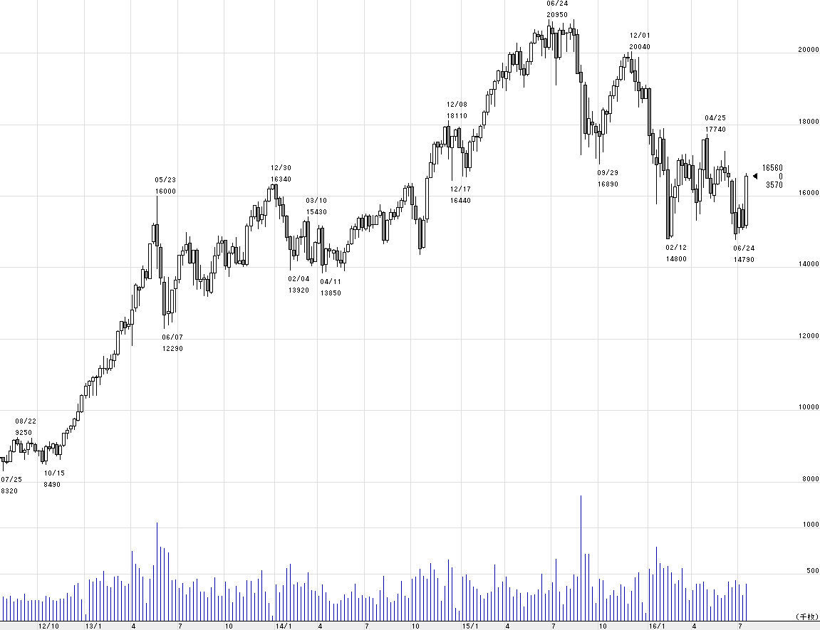 引け前に一段安し、一時安値39,090円まで突っ込むが、逆引けピンで結局本日の中央値水準で取引を終了。